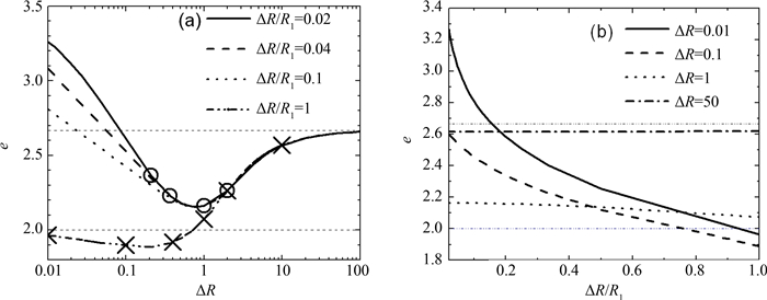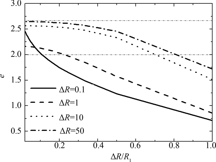 图 3 参数e随壳层光学厚度ΔR和几何结构ΔR/R1的变化 Fig.3 (a) Geometric factor e vs.optical thickness ΔR; (b) geometric factor e vs. geometric structure ΔR/R1 |