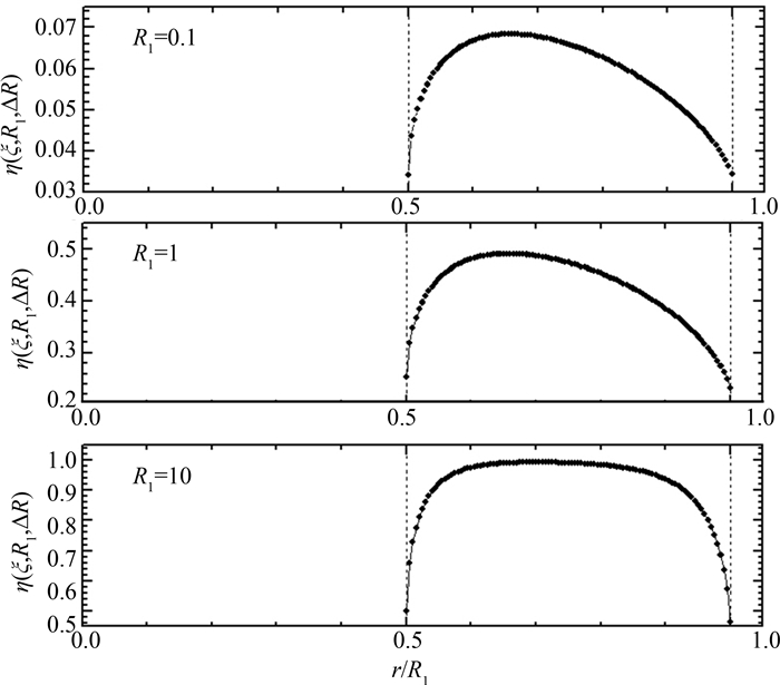 图 2 在ΔR=0.5R1的几何结构下,几何因子η(R, ΔR, ξ)随径向ξ的函数关系 Fig.2 Geometric factor η(R, ΔR, ξ) as functions of ξ as ΔR=0.5R1 |
