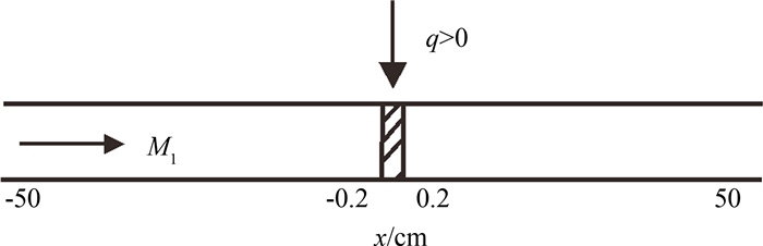 考虑不同来流情况下注入粒子对流场的影响.图 1是计算域的示意图,图中q代表注入粒子的质量,M1代表来流马赫数.计算域是100 cm×0.3 cm长方形,气流沿x轴正向流动,-50 cm≤x≤50 cm,y轴左右两端为开口边界条件,中间为固壁边界条件,网格大小是0.1 cm×0.1 cm.在算法上通过每个计算时间步对位置-0.2 cm≤x≤0.2 cm施加当地高数密度的粒子参数条件,来实现在该处往稳定流场中持续注入速度为0的固体粒子,使填入质量比κ=0.5.来流温度为293 K,压强为101 300 Pa的氮气.粒子直径5 μm,材质是铜,密度8 960 kg·m-3.