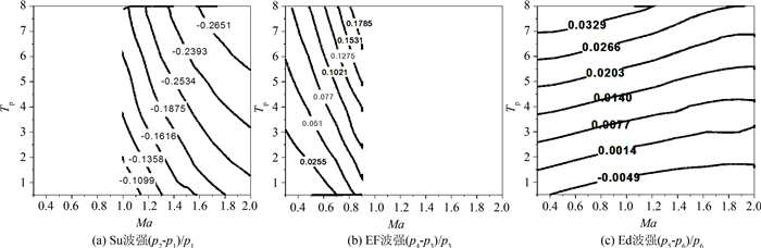 图 9(a)、(b)、(c)分别为来流亚声速、跨声速和超声速下流场固定时刻流场压强沿x轴向分布示意图.上行压缩波Su的波强是(p2-p1)/p1,稀疏波EF的波强为(p4-p3)/p3,下行稀疏波Ed的波强是(p5-p6)/p6.图 10是0.45 ms时在不同的流场速度和粒子温度情况下各个非定常波波强的相图.从中可以发现,上行压缩波Su和稀疏波EF的波强远大于下行稀疏波Ed,增大来流马赫数和初始粒子温度均会增大Su波系和EF波系的强度.在相同来流马赫数下,随着注入粒子的温度升高,Ed波的波强先是减小,直至波系结构改变,稀疏波转化为压缩波.其后压缩波的波强又会逐渐增大.另一方面,对于相同的注入粒子温度,增大来流速度,当注入粒子的焓值高于流场焓值时,在稀疏波EF的波后还会存在一道压缩波向下游传播,随着来流速度的增大,压缩波的波强会逐渐减弱,但波系结构不会变化.如果注入粒子焓值低于流场焓值,在稀疏波EF的波后会存在一道稀疏波向下游传播,随着来流速度的增大,稀疏波的波强反而会增大.