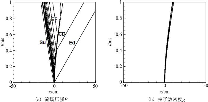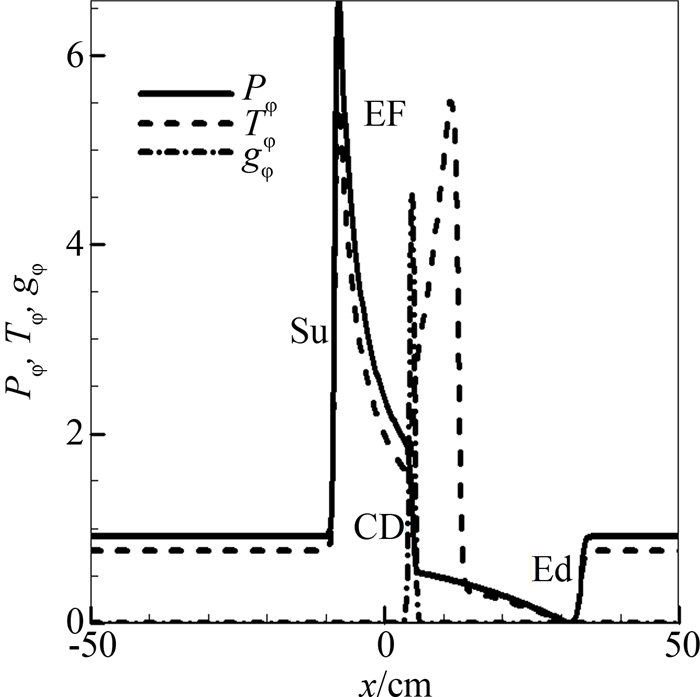 控制来流马赫数为0.6,同时控制注入粒子温度,加入质量初始滞止焓值hp0与气流初始滞止焓值h0相等,此时的流场只存在添质效应.图 2为hp0=h0时,亚声速条件下粒子数密度g和流场压强P的x-t分布图.注入粒子对亚声速流场形成“堵塞”,于x=0处分别产生一簇上行压缩波Su和下行稀疏波EF,EF之后存在一簇稀疏波Ed,并且在波系EF和Ed之间存在一处接触间断CD.从图 2中可以看出添质引起的波系变化和粒子随气体流动不断加速的过程.图 3是0.6 ms时流场压强P、温度T、粒子密度g的沿x轴向分布图.其中P=400Pφ+PC,T=0.4Tφ+TC,g=10gφ,PC=99 635 Pa,TC=292.7 K.可以发现,在粒子分布区域下游,温度有一峰值区域,这一接触间断是由于粒子与气流间动量和能量传递造成的.压强和温度分布中均可清晰观察到上行压缩波Su,稀疏波EF,接触间断CD和下行稀疏波Ed.文献[20]详细阐述了非定常流动不同流速下添质效应产生波系的机理和现象预测,结果与其吻合.