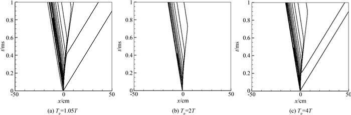 这时增大注入粒子的温度,在考虑流场添质效应的同时,考虑流场的加热效应.图 4为Tp=1.05T(hp0=h0)、2T、4T三种情况下1 ms内的流场压强x-t波系分布.图 5(a)为0.6 ms时Tp=0.5T,1.05T(hp0=h0),2T,3T,4T五种情况下的流场压强的沿x轴向分布.从图中可以得出,对于亚声速流场,加热会使流场内气体产生膨胀,这时加热效应与添质效应对流场的影响逐渐抵消,流场下游压强逐渐增大,上行压缩波Su和下行稀疏波EF逐渐增强,下行稀疏波Ed逐渐减弱直至下行稀疏波转化为压缩波.当Tp=2T时,如图 4(b)所示,向下游传播的稀疏波系已非常弱,基本可以忽略.继续增大注入粒子温度,加热效应的影响继续增大,转化后的压缩波逐渐增强.文献[20]同时详细阐述了非定常流动不同流速下加热效应产生波系的机理和现象预测,可以发现加热流下游波系会对流场产生与添质流相反的影响,本文结果与文献吻合.图 5(b)是0.6 ms时在以上5种情况的粒子速度沿X轴向分布,可以发现,改变注入粒子温度对流场中粒子的速度有4%的影响.