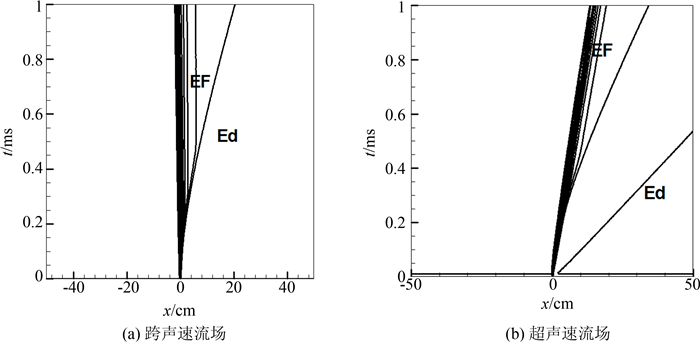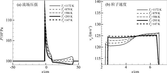 3) 当注入粒子的焓值高于流场焓值时,在下行稀疏波的波后还会存在一道压缩波向下游传播,随着来流速度的增大,压缩波的波强减弱,但波系结构不会变化;如果注入粒子焓值低于流场焓值时,在下行稀疏波的波后会存在一道稀疏波向下游传播,随着来流速度的增大,稀疏波的波强反而会增大.