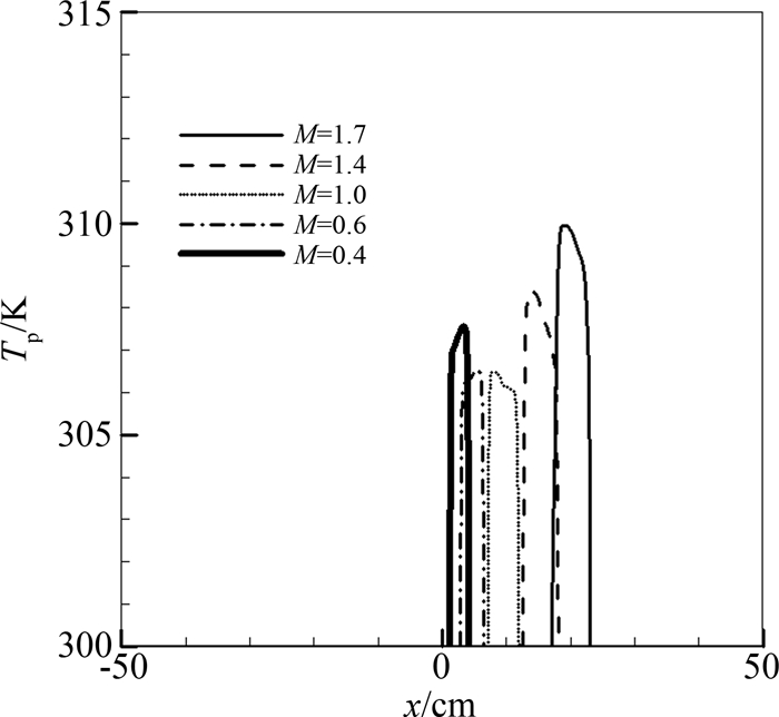 图8 0.6 ms时不同马赫数流场的粒子温度Tp沿x轴向分布 Fig. 8 Particle temperature distributions along x-axis at 0.6 ms as Ma=0.6, 1.0, 1.4 and 1.7 at hp0=h0 |