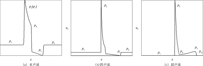 图9 不同马赫数下流场固定时刻流场压强沿x轴向分布示意图 Fig. 9 Gas pressure theoretical distributions along x-axis at fixed time with different flow Mach numbers |