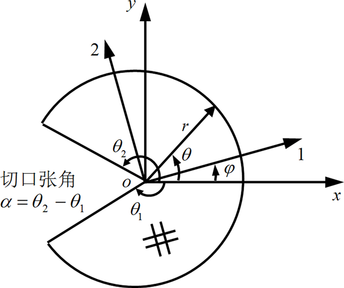1 切口热弹奇性特征方程考虑如图 1所示正交各向异性材料的平面V形切口,在切口尖端定义笛卡尔坐标系(oxy)、极坐标系(orθ)、材料主轴系(o12).其中,x轴与切口平分线重合,材料主轴相对笛卡尔坐标系旋转角为φ.在材料主轴系(o12)下,正交各向异性材料平面应力问题的热弹本构关系为