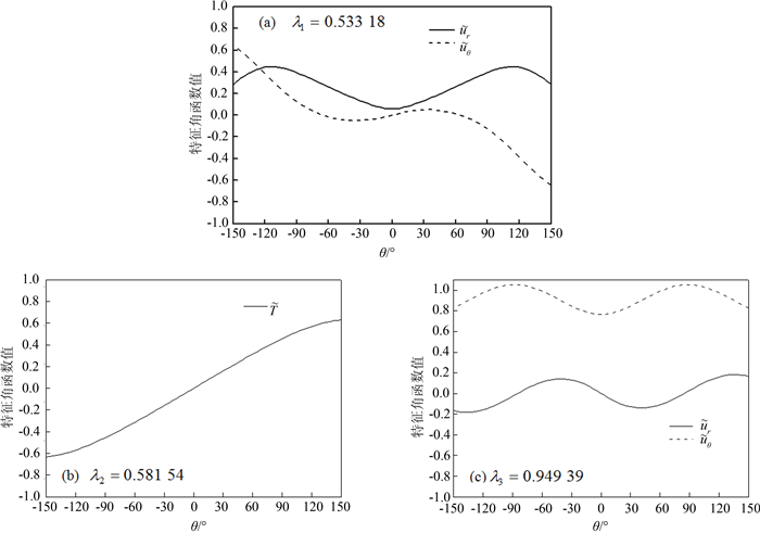 取式(9)中的典型项,即Akrλk${\tilde u}$rk(λk,θ),Akrλk${\tilde u}$θk(λk,θ),Akrλk-1${\tilde T}$k(λk,θ)代入式(8),并将λk,${\tilde u}$rk(λk,θ),${\tilde u}$θk(λk,θ),${\tilde T}$k(λk,θ)简写为λ,${\tilde u}$r,${\tilde u}$θ,${\tilde T}$,有