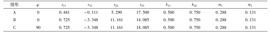 表1 三种材料铺设角φ/°、柔度系数sij/(10-11m2N-1)、导热系数kii/(102WK-1m-1)和热膨胀系数αi/(10-5K-1) Table 1 Plying angle φ/°, flexibility coefficient sij/(10-11m2N-1), thermal conductivity coefficient (kii/(102WK-1m-1) and thermal expansion coefficient (αi/(10-5K-1) in three cases |