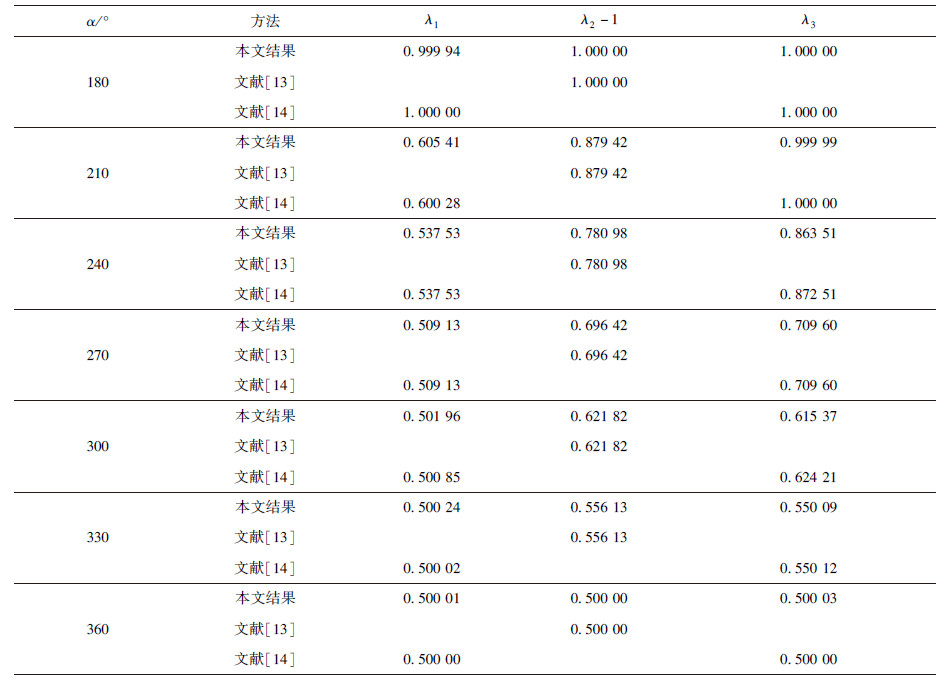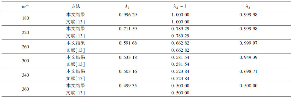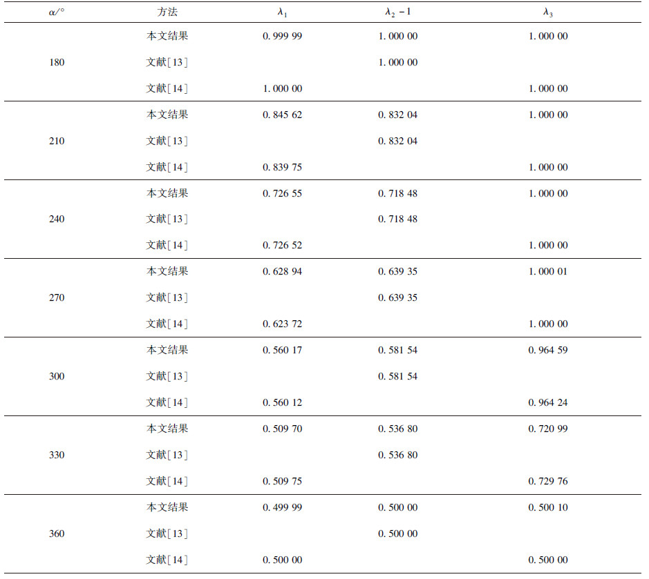 文献[13]分析了切口尖端的热流奇异性,文献[14]则分析了切口尖端的应力奇异性,现将他们的分析结果作为对照一并附上.通过比较可以看出,本文方法可以同时获取应力和热流奇性指数,且与文献结果误差非常小,而文[13]和文[14]是分别从热流和应力奇异性两个侧方面来考虑.因而,本文方法适用性更加广泛.