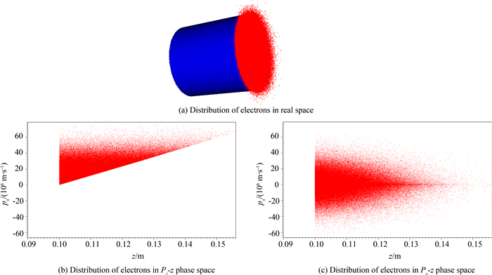 实现电子发射的余弦角分布和指数能谱分布是本计算建模的难点,为此在半开放式的程序中添加了相应的功能模块——用Monte Carlo随机抽样的方法实现电子发射的余弦角分布和指数能谱分布,余弦角分布的实现方法如下:由电子发射的余弦角分布得出电子分布密度函数为f(θ)=cosθ,于是积分分布函数是$F\left(\theta \right)=\int\limits_0^\theta {f\left(\theta \right)d\theta=\sin \theta } $,产生这个分布的方法为:第一步产生一个[0, 1]之间均匀分布的随机数r;第二步计算θ=arcsinr,然后Vz=V0cosθ,Vr=V0sinθ;最后产生[0,2π]之间均匀分布的角度α,令Vx=Vrcosα,Vy=Vrsinα.为了方便,这一段程序用python实现,然后导入到PIC程序中,指数能谱的实现方法类似. 1.3.2 计算结果图 2为初始时刻电子的实空间分布和沿z轴的相空间分布,由实空间分布图 2(a)可见,电子由端面向外发射,发射面各点电子均匀分布;由电子沿z轴的相空间分布图 2(b)、(c)可见,由于电子发射为余弦角分布,初始时刻电子不仅具有沿z轴的法向速度分量,同时具有沿横向的切向速度分量;由于发射的电子能谱为指数谱,所以轴向和横向电子动量分布都有一个较大的区间,且低动量的电子数要多于高动量的电子数.