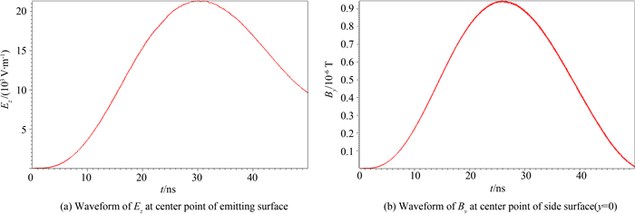 图 3为发射面中点法向电场Ez和取y=0的切面侧面中点处横向磁场By的波形,由图中读出电场Ez最大值为21 kV·m-1,侧面磁场By最大值为9.0×10-7T,由于磁场分布具有旋转对称性,得出电流最大值为Imax=2πRHymax=0.45A,发射面电场和侧面电流最大值都与估算结果量级一致.