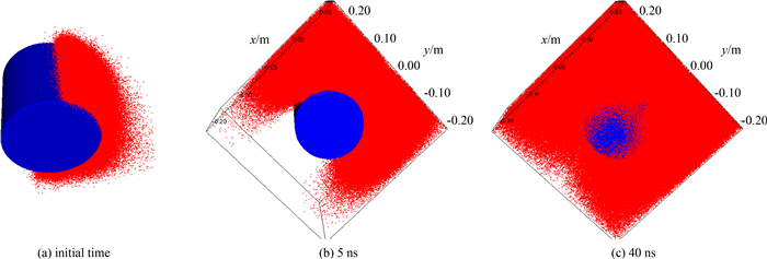 图 4给出不同时刻电子的空间分布,由图 4(a)可见,初始时刻在x大于0的半个侧面上各点电子均匀发射,图 4(b)显示5 ns时电子已到达吸收边界,由于切向速度及空间电荷力的作用电子沿横向扩散,由图 4(c)显示40 ns时电子已充满整个计算空间.