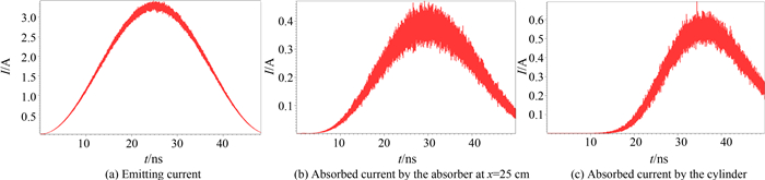 图 5(a)为发射电流波形,电流在25 ns时取得最大值,约为3.3 A;图 5(b)为设在外边界x坐标值最大处且和x轴垂直的的吸收体所吸收的电流波形,其波形时间比发射电流时间略有延迟,吸收电流最大值约为0.38 A,另外发射电流还会被其余几个边界处的吸收体吸收;由于导体上正电荷的存在及空间电荷效应,电流还会被导体本身吸收,吸收电流波形如图 5(c)所示,最大值约为0.55 A.