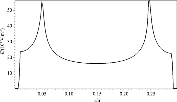 图6 t=43ns时y=0, x=10.2cm线上的电场分布 Fig. 6 Distribution of electric field on line of y=0, x=10.2cm |