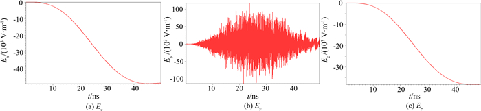 图7 坐标点x=10.2 cm, y=0, z=10.0 cm处的电场波形 Fig. 7 Waveform of electric field at point of x=10.2 cm, y=0, z=10.0 cm |