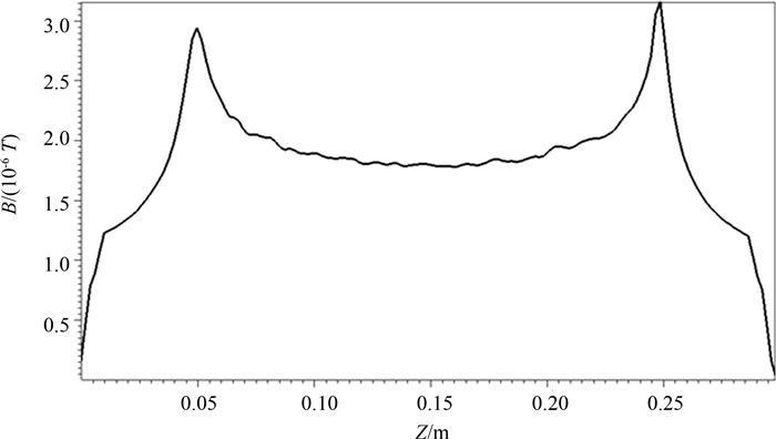 图9 坐标点x=0, y=10.2cm, z=10.0cm处的磁场波形 Fig. 9 Waveform of magnetic field at point of x=0, y=10.2cm, z=10.0cm |