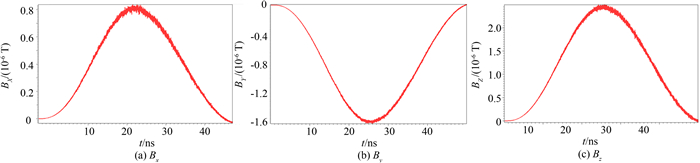 本模型中只有半个侧面发射,电流分布比较复杂,我们只分析空间磁场的情况,分析可得x=0的切面上磁场最强,磁场幅度都达到10-6T量级,其中端面和侧面交界处磁场最强,因磁场由电流产生,因此当电流取最大值时,即25 ns时磁场也达到最大值.图 8给出25 ns时此切面上y=10.2 cm线上的磁场幅度分布,端面和侧面交界处磁场最高,达3.0×10-6 T.图 9给出磁场最强处即x=0的切面上端面和侧面交界处各个磁场分量的波形,三个方向磁场分量都在10-6T量级,各磁场分量都在25 ns取得最大值,当发射电流结束时磁场消失.
