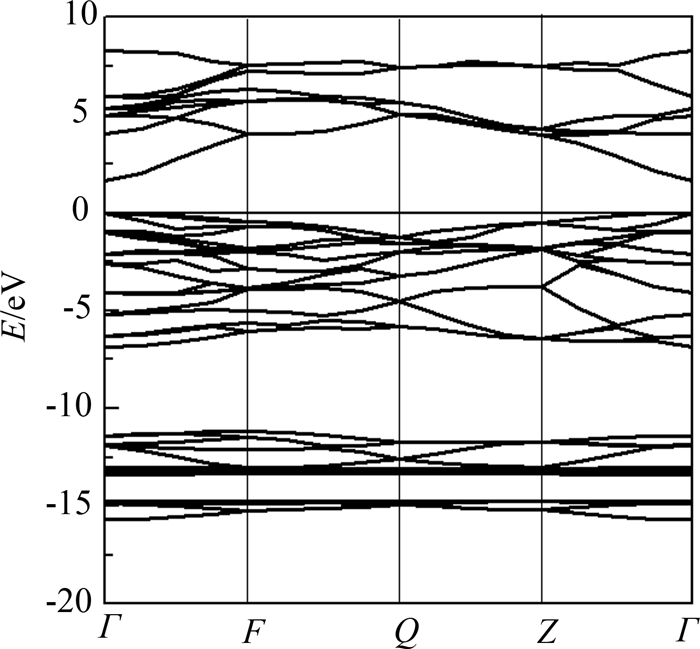2 结果与讨论 2.1 能带结构为了与其它理论研究进行比较,我们首先计算了理想纤锌矿GaN 的能带结构,如图 2所示.可以看出 GaN 是直接带隙半导体,导带底和价带顶都位于布里渊区的G点上,禁带宽度为 1.98 eV,均小于实验值3.39 eV,与邢海英等[25]及Pugh[26]的计算结果一致.能隙的计算结果偏低是由于在计算中采用的密度泛函理论是基态理论[27],而能隙属于激发态,但这并不影响对GaN电子结构的理论分析.