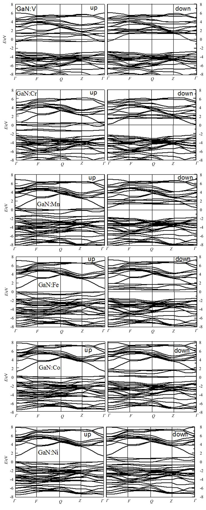 图3 GaN∶TM(TM=V,Cr,Mn,Fe,Co,Ni)能带结构 Fig. 3 Energy band structures of GaN∶TM(TM=V,Cr,Mn,Fe,Co,Ni) |