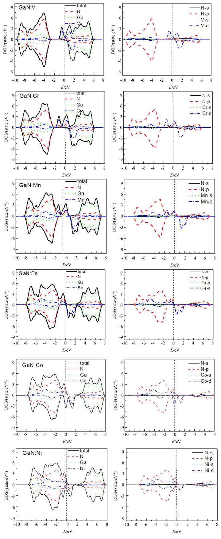 图4 GaN∶TM(TM=V,Cr,Mn,Fe,Co,Ni)的总态密度和分态密度 Fig. 4 Partial and total densities of state (DOS) for GaN∶TM(TM=V,Cr,Mn,Fe,Co,Ni) |