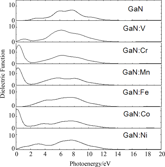 图5 GaN∶TM(TM=V,Cr,Mn,Fe,Co,Ni)的介电函数虚部 Fig. 5 Imaginary parts of dielectric functions for GaN and GaN∶TM(TM=V,Cr,Mn,Fe,Co,Ni) |