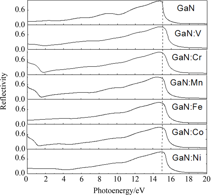 图6 GaN和GaN∶TM(TM=V,Cr,Mn,Fe,Co,Ni)的反射谱 Fig. 6 Reflectivity for GaN and GaN∶TM(TM=V,Cr,Mn,Fe,Co,Ni) |