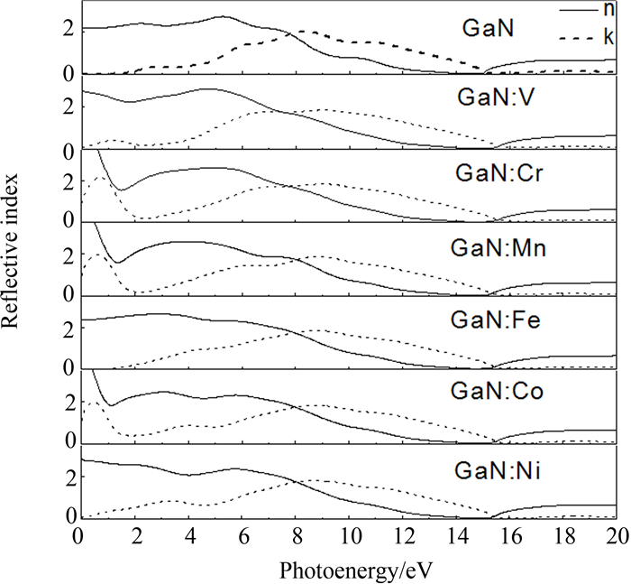 图7 GaN∶TM(TM=V,Cr,Mn,Fe,Co,Ni)的复折射率函数 Fig. 7 Complex refractive index functions for GaN and GaN∶TM(TM=V,Cr,Mn,Fe,Co,Ni) |